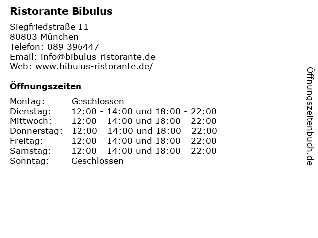 | Öffnungszeiten Ristorante Bibulus in München anzeigen | |