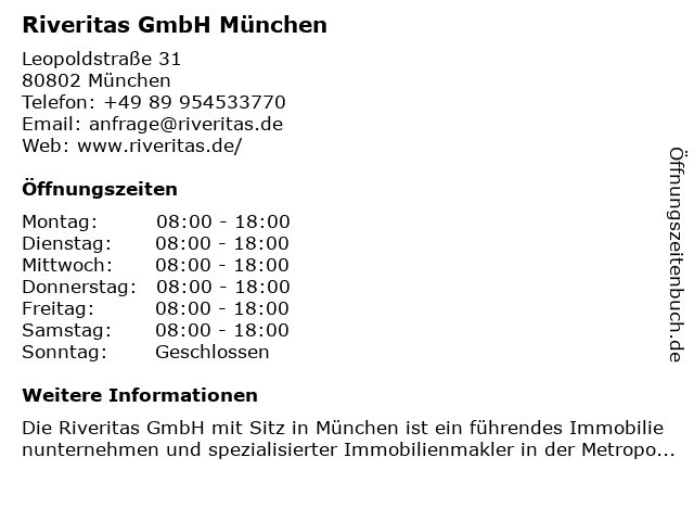 | Öffnungszeiten Riveritas GmbH München in München anzeigen | |