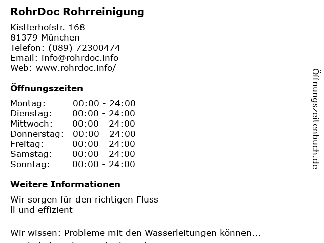 | Öffnungszeiten RohrDoc Rohrreinigung in München anzeigen | |