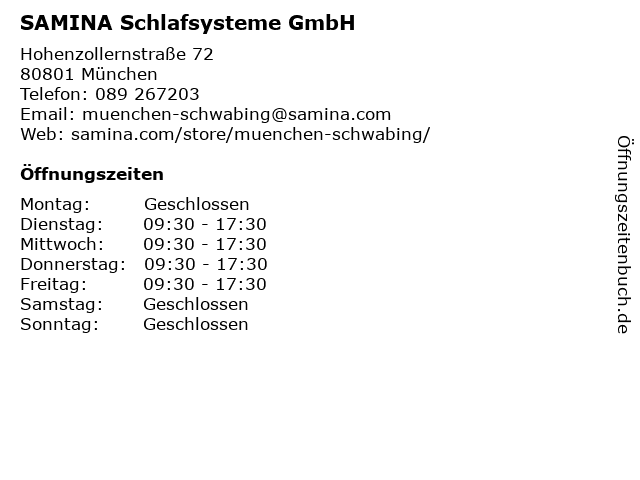 | Öffnungszeiten SAMINA Schlafsysteme GmbH in München anzeigen | |