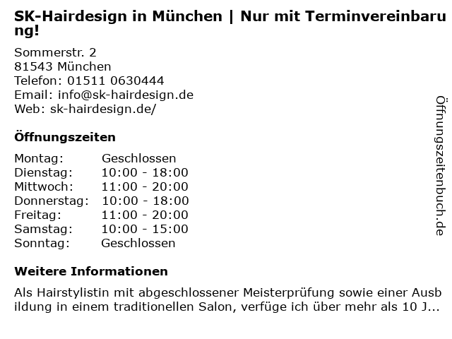 Branchen & Suchbegriffe zu SK-Hairdesign in München | Nur mit Terminvereinbarung!:hairdesign, mit, nur, sk, terminvereinbarung! |
