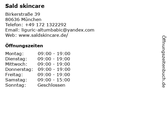 | Öffnungszeiten Sald skincare in München anzeigen | |