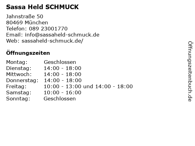 | Öffnungszeiten Sassa Held SCHMUCK in München anzeigen | |