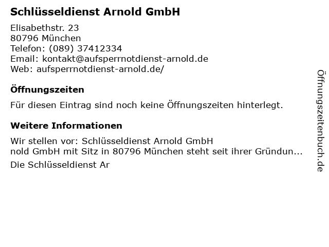 | Öffnungszeiten Schlüsseldienst Arnold GmbH in München anzeigen | |