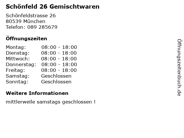 | Öffnungszeiten Schönfeld 26 Gemischtwaren in München anzeigen | |