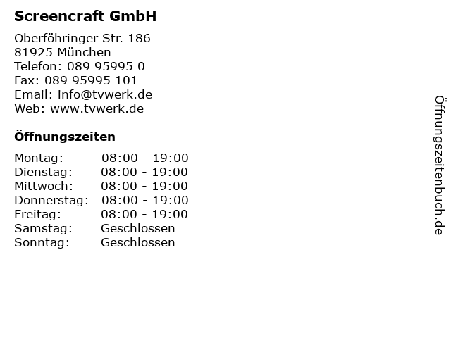 | Öffnungszeiten Screencraft GmbH in München anzeigen | |