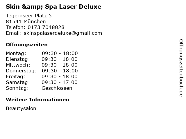 | Öffnungszeiten Skin & Spa Laser Deluxe in München anzeigen | |