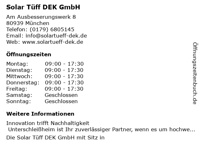 | Öffnungszeiten Solar Tüff DEK GmbH in München anzeigen | |