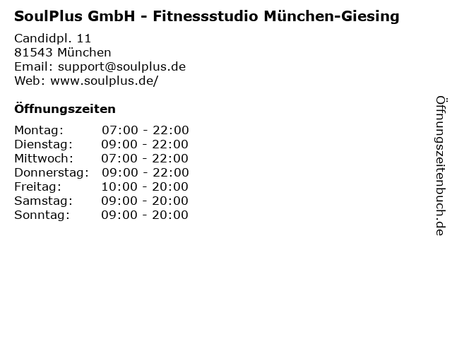 | Öffnungszeiten SoulPlus GmbH - Fitnessstudio München-Giesing in München anzeigen | |