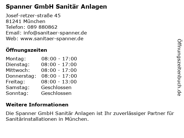 | Öffnungszeiten Spanner GmbH Sanitär Anlagen in München anzeigen | |