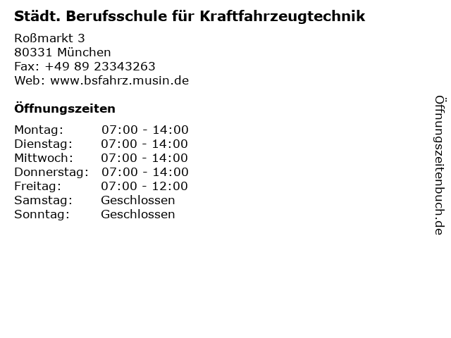 | Öffnungszeiten Städt. Berufsschule für Kraftfahrzeugtechnik in München anzeigen | |