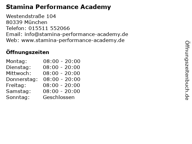 | Öffnungszeiten Stamina Performance Academy in München anzeigen | |