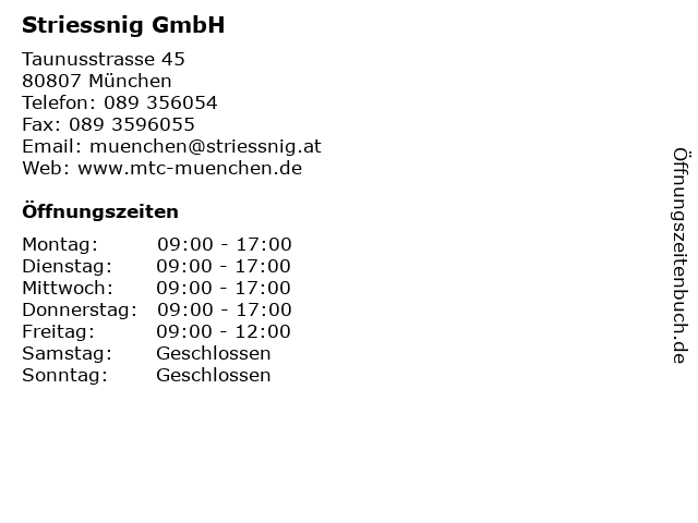 | Öffnungszeiten Striessnig GmbH in München anzeigen | |