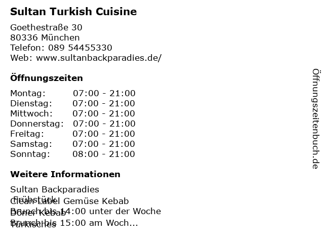 | Öffnungszeiten Sultan Turkish Cuisine in München anzeigen | |