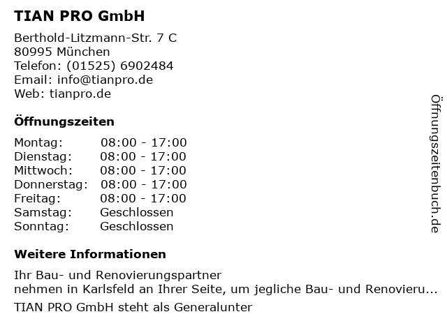 | Öffnungszeiten TIAN PRO GmbH in München anzeigen | |