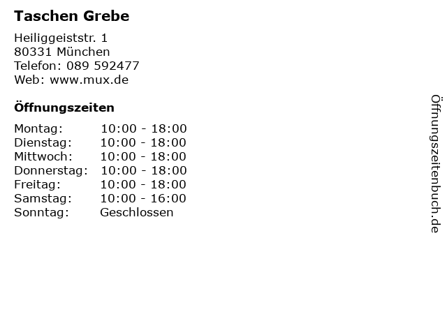 | Öffnungszeiten Taschen Grebe in München anzeigen | |