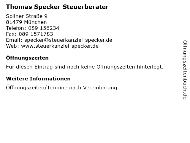 | Öffnungszeiten Thomas Specker Steuerberater in München anzeigen | |