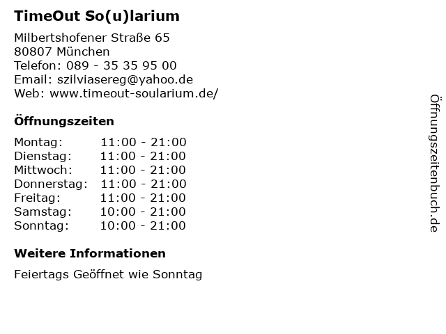 | Öffnungszeiten TimeOut So(u)larium in München anzeigen | |