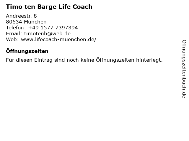 | Öffnungszeiten Timo ten Barge Life Coach in München anzeigen | |