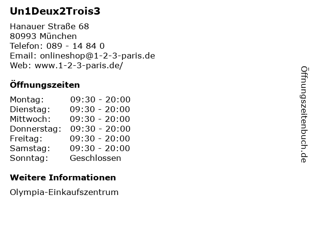 | Öffnungszeiten Un1Deux2Trois3 in München anzeigen | |