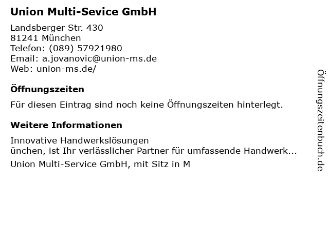 | Öffnungszeiten Union Multi-Sevice GmbH in München anzeigen | |