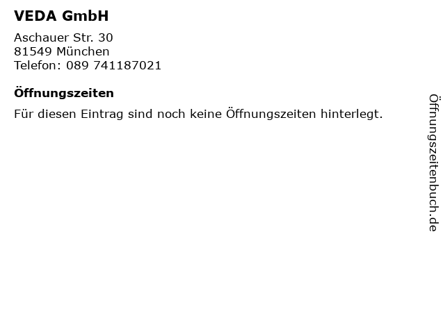 | Öffnungszeiten VEDA GmbH in München anzeigen | |