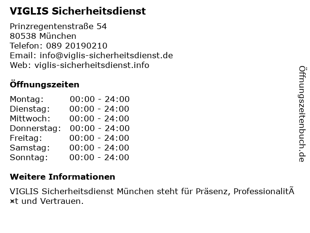 | Öffnungszeiten VIGLIS Sicherheitsdienst in München anzeigen | |