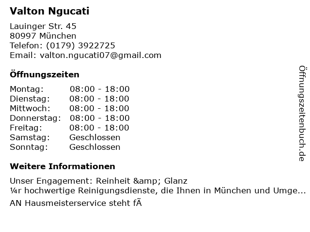 | Öffnungszeiten Valton Ngucati in München anzeigen | |