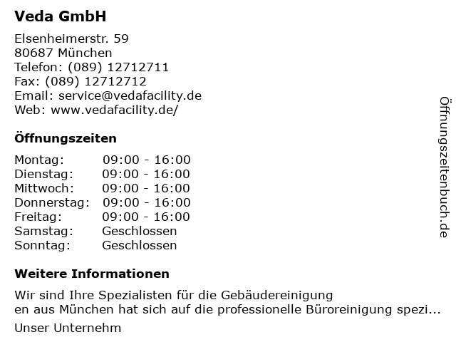 | Öffnungszeiten Veda GmbH in München anzeigen | |