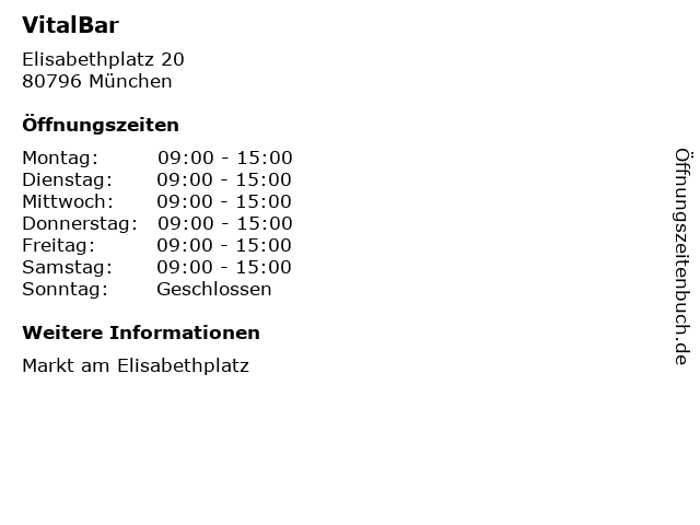| Öffnungszeiten VitalBar in München anzeigen | |