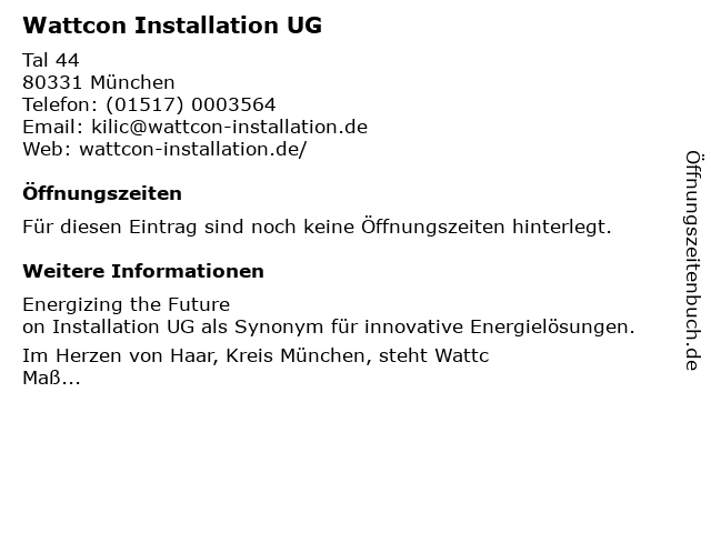 | Öffnungszeiten Wattcon Installation UG in München anzeigen | |