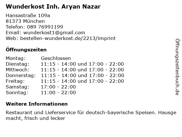 | Öffnungszeiten Wunderkost Inh. Aryan Nazar in München anzeigen | |