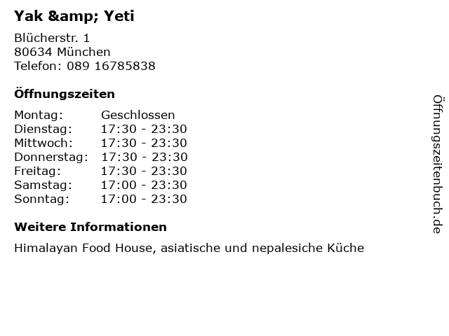 | Öffnungszeiten Yak & Yeti in München anzeigen | |