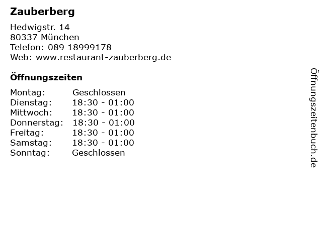 | Öffnungszeiten Zauberberg in München anzeigen | |