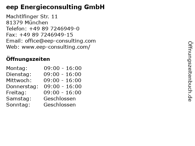 | Öffnungszeiten eep Energieconsulting GmbH in München anzeigen | |
