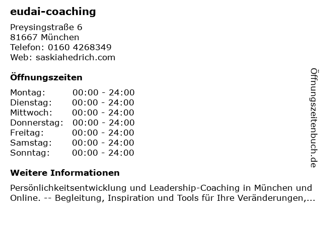 | Öffnungszeiten eudai-coaching in München anzeigen | |
