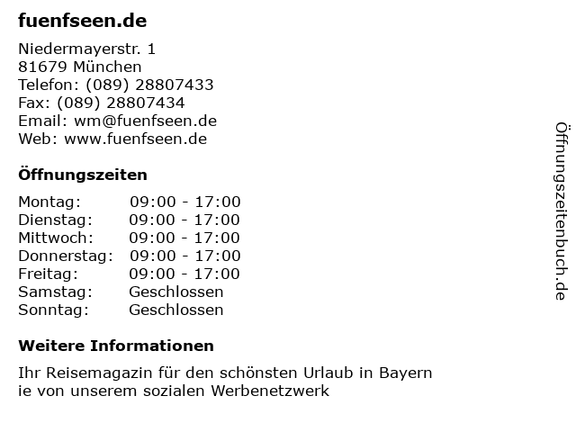 | Öffnungszeiten fuenfseen.de in München anzeigen | |