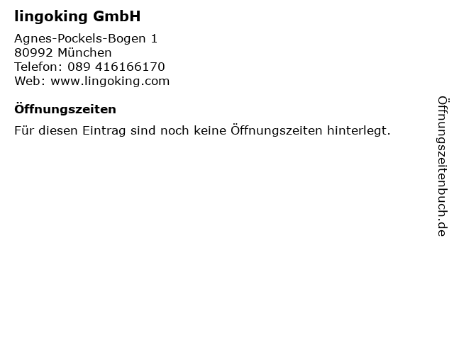 | Öffnungszeiten lingoking GmbH in München anzeigen | |