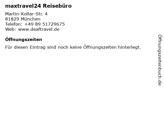 | Öffnungszeiten maxtravel24 Reisebüro in München anzeigen | |