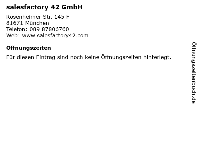 | Öffnungszeiten salesfactory 42 GmbH in München anzeigen | |