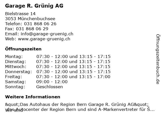 | Öffnungszeiten Garage R. Grünig AG in Münchenbuchsee anzeigen | |