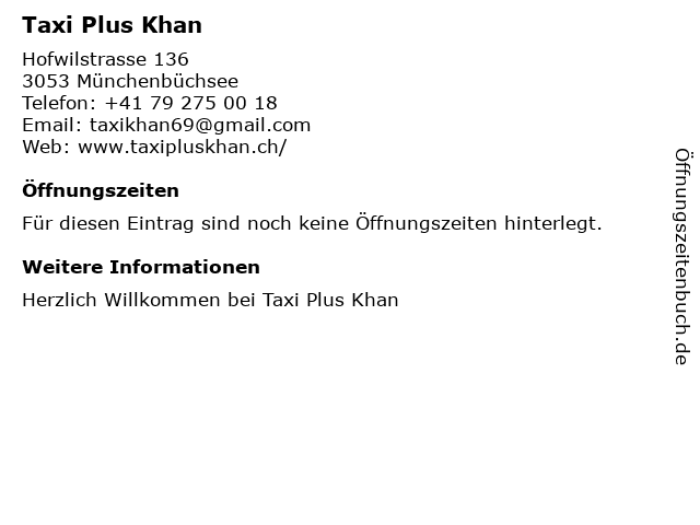 | Öffnungszeiten Taxi Plus Khan in Münchenbüchsee anzeigen | |