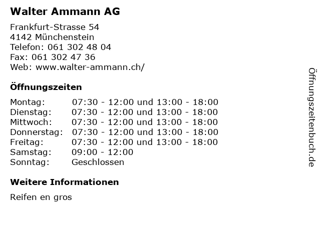 | Öffnungszeiten Walter Ammann AG in Münchenstein anzeigen | |