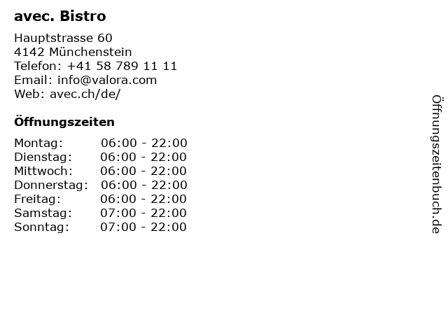 | Öffnungszeiten avec. Bistro in Münchenstein anzeigen | |