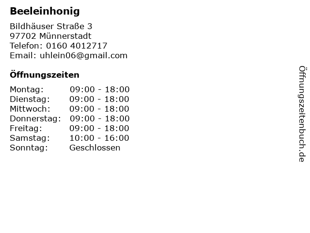 | Öffnungszeiten Beeleinhonig in Münnerstadt anzeigen | |
