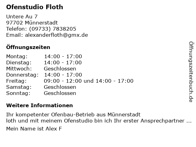 | Öffnungszeiten Ofenstudio Floth in Münnerstadt anzeigen | |