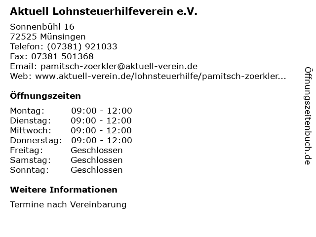 Branchen & Suchbegriffe zu Aktuell Lohnsteuerhilfeverein e.V.:aktuell, altbayerischer, anja, beratungsstelle, e.v, e.v., lohnsteuerhilfeverein, pamitsch, steuer, steuerberatung, zörkler |