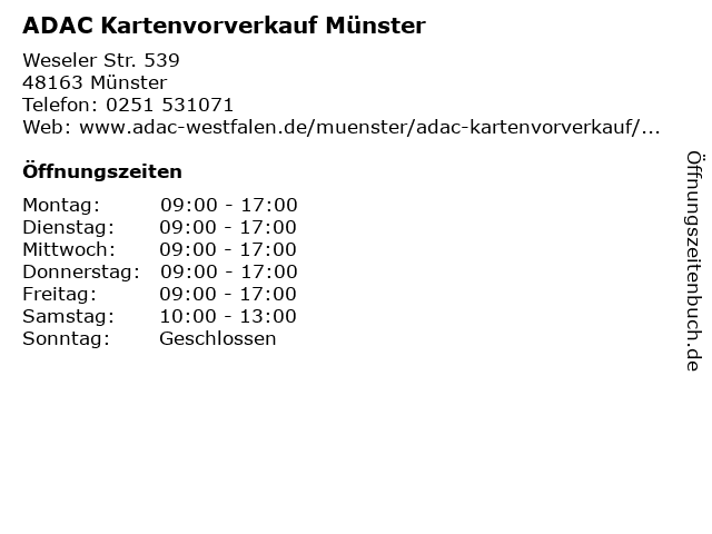 | Öffnungszeiten ADAC Kartenvorverkauf Münster in Münster anzeigen | |
