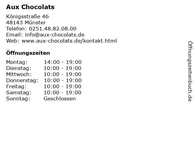| Öffnungszeiten Aux Chocolats in Münster anzeigen | |