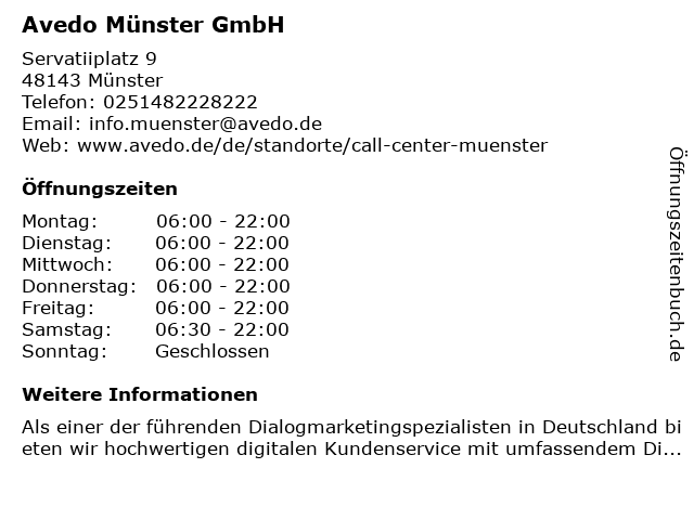 | Öffnungszeiten Avedo Münster GmbH in Münster anzeigen | |